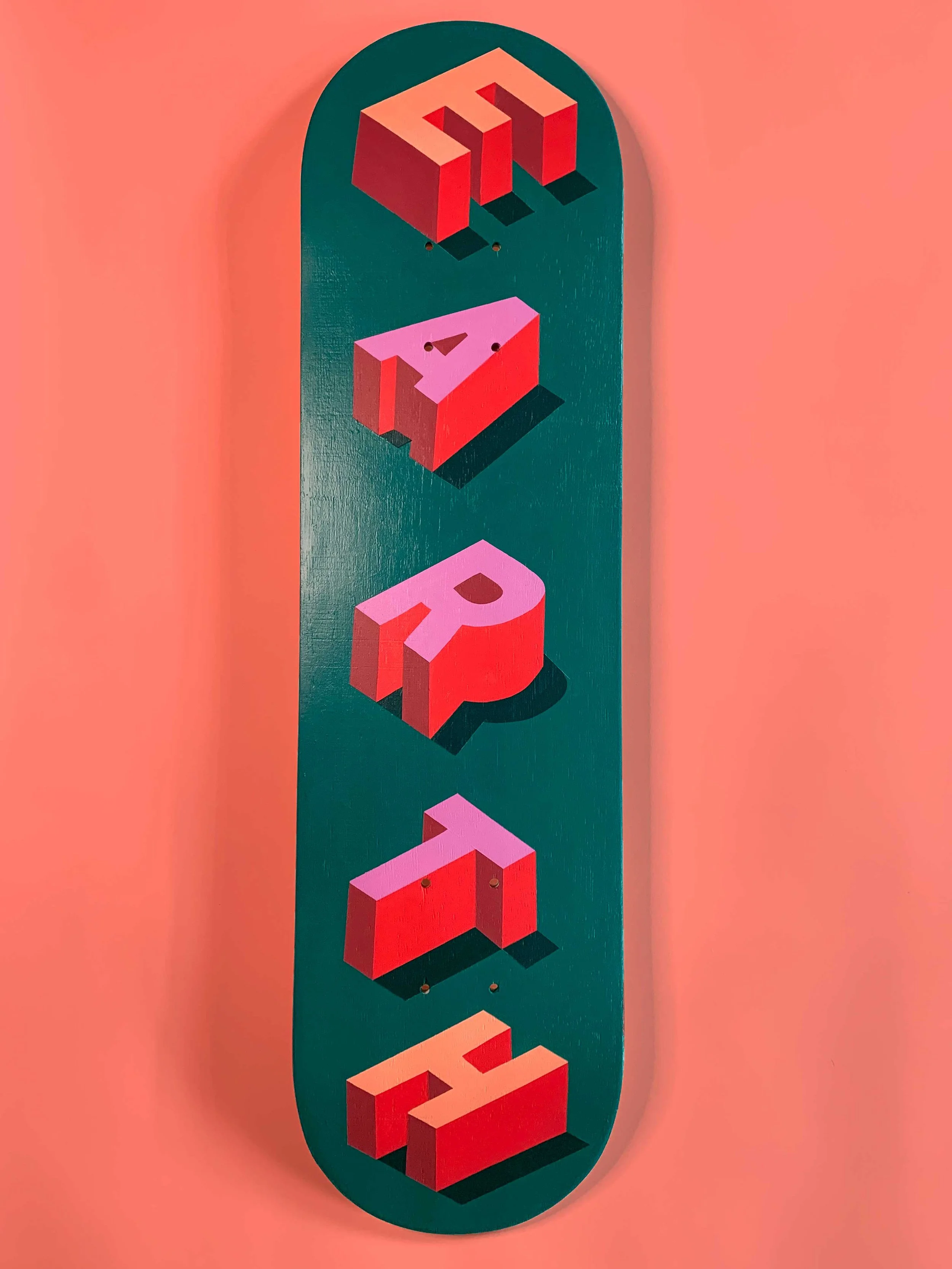 In my house, art and the Earth are the two most talked about topics on any given day. So it felt right to paint this fun play on words on one of my maplewood skateboards.